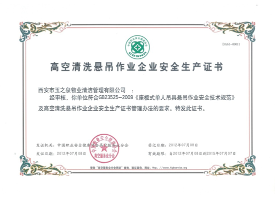 中國職業(yè)安全健康協(xié)會高空服務(wù)業(yè)分會對西安市玉之泉物業(yè)清潔管理有限公司進(jìn)行考察,最后在2012年7月8日向西安市玉之泉物業(yè)清潔管理有限公司頒發(fā)證書。